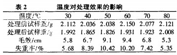 固定浴比1:20,纖維素酶濃度3g,l,處理時間60min,pH7,JFClg/l,改變溫度對處理效果的影響結果見表2。
