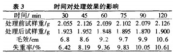 由表3可以得出,當處理時間小于60rain時,隨著處理時問的延長,失重率和毛效增加明顯,處理時間大于60min后,隨著處理時間的延長,增加不明顯。表明在堆置時間為60min時,酶的催化作用已經很充分,表現為底物的失重率已經達到很高,吸水性也好,因此,考慮到節省時間,選60min左右為最適堆置時間。