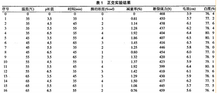 3.1.1正交實驗設計根據纖維素酶最佳作用條件范圍進行了四因素四水平的正交實驗設計,并測其減量率、斷裂強力、白度、毛效。以減量率為主要指標的L16(441正交實驗和極差分析結果可見表1、表2。