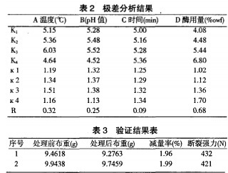 討論:從表1、表2中可知酶發揮的最佳活力,棉布強力損失在可接受范圍之內的最佳水平組合為:酶用量3%owl、溫度55℃、pH值5.5、作用時間55min。