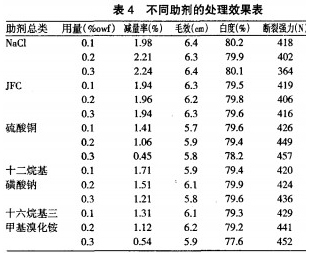 討論:從表4中可得纖維素酶的最佳處理條件為:酶用量3%owl、溫度55℃、pH為5.5、作用時間55min、作用助劑NaC1、用量為0.2%o。以下有關纖維素酶的實驗均在此條件下進行的。