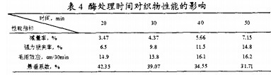 用3.0%(0-w-f)纖維素酶整理液,浴比l:l0,pH=5,溫度500C處理不同的時間,處理結果見表4。