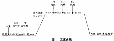 染色處方染料2%(O.W.f),元明粉3O~70g/L,純堿4~8L,平平加00.4g/L,浴比1:30,固色溫度為50~80℃。