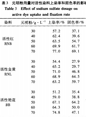 固定溫度60℃、純堿5L,按1.3實驗方法改變元明粉用量,對漂白大豆纖維針織物進行染色,染畢,測定上染百分率和固色率,結果見表3。