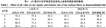 由表4得知,隨著pH值的降低,3只染料在大豆纖維上的上染率和固色率逐漸增加。對于大豆纖維而言,按常理,當pH較低時,大量的氨基發生離子化,上染大豆纖維的活性染料與纖維上的質子化的氨基以離子鍵結合的比例增加,這也是在酸性浴中,這些染料對大豆纖維上染率比較高的原因所在。但pH小于3時,纖維的某些性能會受到一定程度的影響。