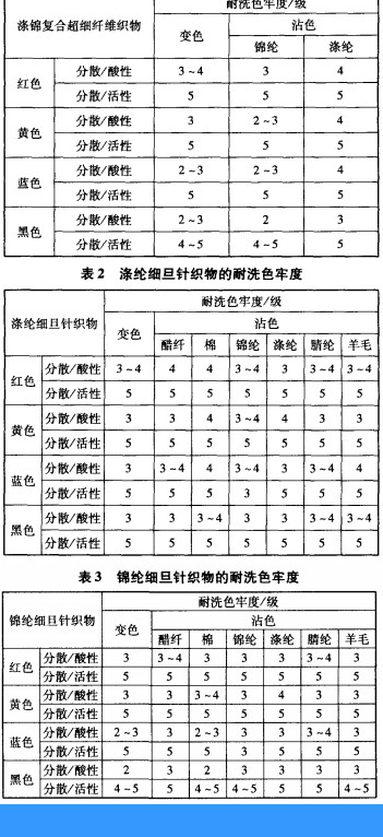 (4)采用TerasilW分散染料/Eriofast活性一浴法染滌錦復合超細纖維,有效解決了超細纖維顯色性差帶來的難染深的問題。與傳統的分散/酸性一浴法相比,還具有較高的耐洗色牢度,很好地解決了滌錦復合超細纖維織物染色牢度差的問題