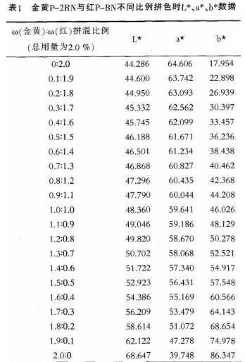 染料拼混時.總用量從0.0001%~4%分為13檔。表1所示是汽巴克隆金黃P一2RN(以下簡稱金黃P一2RN)與汽巴克隆紅P—BN(以下簡稱紅P—BN)染料在總用量為2%的條件下.計算得到的不同拼混比例的L*a*b*值。