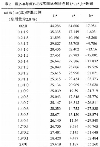 表2所示是汽巴克隆藍P—B(以下簡稱藍P—B)與紅P—BN染料在總用量為2%的條件下.計算得到的不同拼混比例的L*a*b*值。