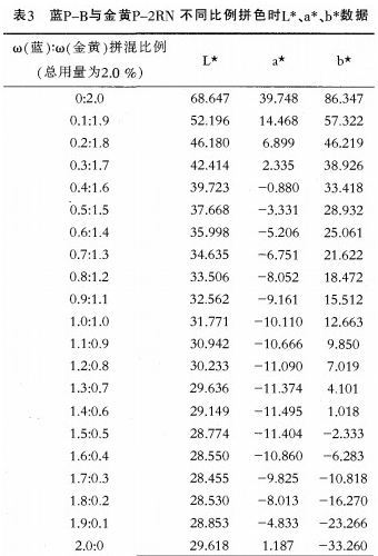 表3所示是藍P—B與金黃P一2RN染料在總用量為2%的條件下.計算得到的不同拼混比例的L*a*b*值。