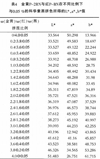 四色印花是通過調節三原色和黑色的比例形成絢麗多彩的圖象效果為了使色彩的顯示更厚實豐滿.需要加入黑色染料來調節明度變化為了組成一個顏色空問的封閉體.在染料總用量為4%時調節染料的不同比例再分別加入用量為0.05%、0.15%、0.35%、0.6%、1%、2%、3%、4%、5%的科華素印花黑ExceL Black coiLc.染料.組成一個封閉的曲線圖形表4為金黃P-2RN與紅P—BN在染料拼混用量為4%時再加入用量為0.05%的科華素印花黑ExceL Black coiLC(以下簡稱科華素黑)后的L*a*b*值。