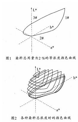 根據表1、2、3數據可畫出總用量為2%的不同染料比例混合的等濃度顏色曲線如圖1所示.從圖中可以看出2%的等濃度曲線由三部分曲線組成.1#、2#、3#是分別由表1、2、3數據得到的曲線。以此方法可以分別獲得染料總用量為4%、3%、2%、1%、0.5%、0.4%、0.2%、0.1%、0.05%、0.01%、0.0007%、0.0003%、0.0001%時等濃度條件下的合成顏色曲線如圖2所示。