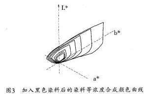 依照上面同樣的方法.在藍P—B與紅P-BN、藍P—B與金黃P一2RN分別以4%的用量按不同比例混合后,再分別加入用量為0.05%、0.15%、0.35%、0.6%、1%、2%、3%、4%、5%的科華素黑.計算得到合成顏色的L*a*b*值。用這些數據作出染料等濃度條件下的合成顏色曲線如圖3所示。圖3中最外一層為三原色染料兩兩拼混總用量