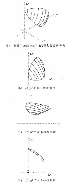 使用soLidworks中曲面建構命令連接圖4中的曲線.生成曲面圖5是金黃P一2RN與紅P—BN拼色所得色空間的曲面圖6為該曲面在a*、b*平面上的投影,圖7為該曲面在L*、b*平面上的投影,圖8為該曲面在、a平面上的投影圖。