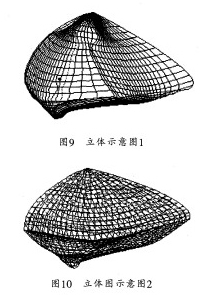將制作好的曲面通過軟件縫合.生成封閉曲面:再使用填充實體命令生成實體。然后用軟件測量命令計算實體模型的體積。圖9是用紅P—BN、金黃P一2RN、藍P—B、科華素黑四種染料構建的色空間的立體示意圖。