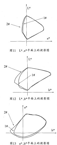 從上述體積數中可看出第二組染料體積要比第一組大一些,相差9.2%。由于體積大小表征染料的L*、a*、b*值在空間覆蓋的范圍,色空間的體積越大.所能夠拼色的色彩范圍越廣所以理論上第二染料組的顏色表現范圍比第一組要大一些為了更好地比較兩個立體空問的形狀.可通過投影圖作比較從圖11L*、a*平面上的投影圖可以看出兩組染料拼色空間區域基本一致.只是第二染料組在綠色方向拼色比第一組稍大些。從圖12L*、b*平面上投影圖可得到第二組在藍色區域(b*方向)比第一組區域明顯大。從圖13a*、b*平面上的投影圖也可看出第二組比第一組的投影面大.這進一步說明了第二組染料比第一組染料的體積大、色域廣.有較大的顏色表現空間。因此第二染料組能適應顏色范圍更大的四色印花應用.