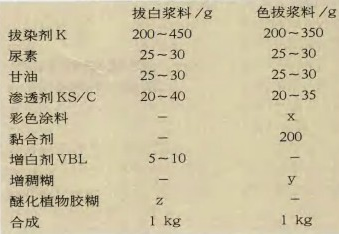色漿的調配。拔白漿:原糊在攪拌下,首先加入尿素和甘油,再加拔染劑K,攪拌一直到橘紅色顆粒徹底消失后為止,最后加入滲透劑KS/C,為提高拔白度,增白劑VBL加入時,先用少量乙醇潤濕均勻后用熱水溶解,并攪勻即可。色拔漿:在拔白漿基礎上再加入黏合劑和涂料攪勻即可。