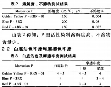 由表3得知:P型活性染料白底沾色牢度好,花紋鮮艷;摩擦牢度好,符合服用要求。
