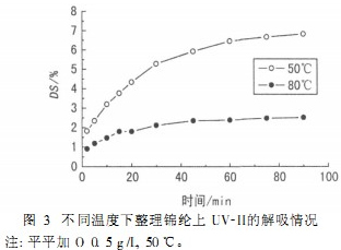 圖3為經(jīng)UV-II紫外吸收劑于50℃和80℃整理后的織物在0.5g/L平平加O溶液中的解吸情況。