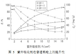 從圖5可知,三種紫外吸收劑在普通錦綸上的吸附量均隨其用量的增加而增加,但增加幅度不同。其中,UV-II紫外吸收劑的增加幅度最大,說明其在錦綸上的提升性優(yōu)于其它兩只紫外吸收劑。這可能與反應型紫外吸收劑本身的母體結(jié)構(gòu)、反應活性和穩(wěn)定性以及對纖維的親和力有關(guān)。此外,隨著紫外吸收劑用量的增加,吸盡率呈現(xiàn)下降趨勢,利用率變小,尤其是UV-I紫外吸收劑的下降幅度最大。由此可見,不同的商用紫外吸收劑對錦綸的提升性和利用率,存在很大的差別,在實際生產(chǎn)中應選擇提升性好、吸盡率高的紫外吸收劑對錦綸進行整理。
