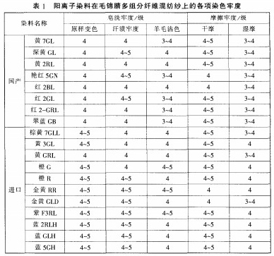 選擇部分國產染料以及部分進口阿斯曲拉陽離子染料.染料濃度1.5%.分別進行陽離子染料對羊毛的沾色試驗.結果見表1。