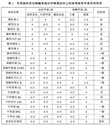 從表1中得出.所選擇的染料在腈綸染色過程中.對羊毛沾色比較小.沾色牢度在3-4級以上.而其他的各項染色牢度良好。