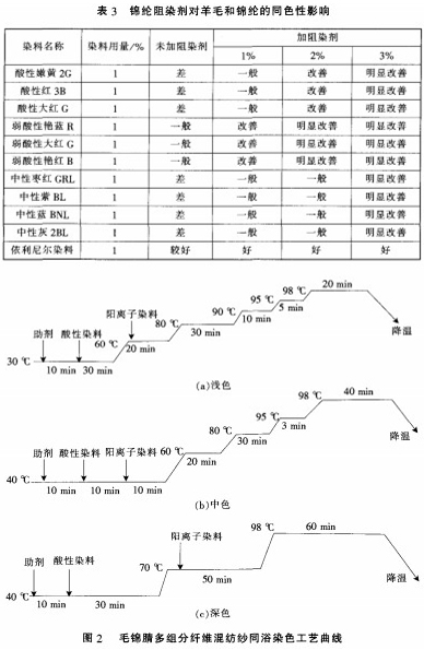 從表3中得出.阻染劑不同的用量對酸性染料或中性染料在羊毛和錦綸纖維上的分配起到一定的作用通常弱酸性染料的防染劑用量在2%左右.其效果比較明顯:而酸性染料和中性染料的防染劑用量在3%左右。