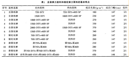 上世紀90年代中期.氨綸開始大量應用于我國的紡織行業。隨著染整工藝的日臻成熟,滌綸緯彈面料、滌綸雙彈面料開始迅速出現并出口最早在國內市場上出現的是滌綸DTY緯彈面料。布面平整、尺寸穩定、回彈性能優良的全滌(DTY)緯向彈力面料成為市場上的新寵隨著國產平幅精練設備的大量運用和染整工藝的不斷改進.全滌(DTY)經緯雙彈面料也迅速涌現全滌長絲(FDY)雙彈面料的出現.是在上世紀90年代后期由于國際市場上錦綸雙彈面料需求量迅速攀升.面料價格較高.而且國內的印染加工企業在當時還沒有完全掌握錦綸雙彈面料的加工方法.所以.市場上很快就出現了用滌綸全長絲(FDY)產品代替錦綸的雙彈面料.迅速地沖擊著國內、國際兩個市場全長絲滌綸雙彈面料容易產生極光印.手感雖然比較滑爽。但是沒有錦綸雙彈面料手感柔軟、色光柔和的特點這些因素都注定了全長絲滌綸雙彈面料的生命周期不可能太長進入本世紀初.以滌錦交織為代表的彈力面料進入了人們的視野特別是近兩年以來.隨著滌錦復合絲的大量運用.新型滌錦彈力面料為服裝面料的開發注入了新的活力表1中列出了滌綸和錦綸彈力面料的一些基本特點。