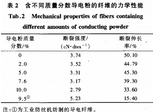 對含不同質(zhì)量分數(shù)導電粉的幾種纖維進行力學性能測試,結果如表2所示。可以看出:在實驗室條件下添加導電粉后紡制的纖維與純PET相比,其斷裂強度和斷裂伸長率均有所下降,但是導電粉質(zhì)量分數(shù)為9.5%時工業(yè)紡導電纖維強度可高達5.23eN/dtex,這說明選擇適當?shù)募徑z和拉伸工藝條件,不僅可以獲得優(yōu)良的導電性能,而且可以大大改變導電纖維的力學性能。