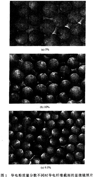 圖1為導電粉質量分數不同時導電纖維截面的顯微鏡照片。從圖中可見,在共混紡絲纖維中導電組分和PET呈近似不相容的兩相。整個導電纖維呈海一島結構,導電組分為島相,纖維基體為海相,島沿纖維軸向分布在海中。