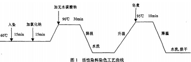 選用活性染料對純棉織物進行染色,其中浴比為1:30,染料濃度為5%(O.w.f),氯化鈉用量為4Og/L,無水碳酸鈉用量為10g/L;皂洗時浴比為1:30,皂粉用量為2g/L,無水碳酸鈉用量為2g/L。染色工藝曲線如圖1所示.