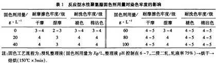 反應(yīng)型水性聚氨酯固色劑的固色工藝流程為:浸軋固色劑整理液_+烘干一焙烘.