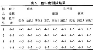 實驗采用GB/T3920—2008《紡織品色牢度試驗耐摩擦色牢度》、GB/T5713—1997《紡織品色牢度試驗耐水色牢度》””‘、GB/T3922—1995《紡織品色牢度試驗耐汗漬色牢度》…,結果見表5。