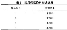 實驗采用GB/T17592—2006《紡織品禁用偶氮染料的測定》,結果見表6通過氣相色譜/質譜法檢測并未發現標準中列出的國家禁止使用的偶氮染料。