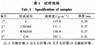 選擇4種織物為試樣進行透濕量測試,即:純棉織物、棉/大豆纖維混紡織物、毛/大豆纖維混紡織物,棉/錦綸纖維混紡織物,其中大豆復合纖維中大豆蛋白含量為40%。分別剪取3塊長0.1m,寬0.04m的試樣,試樣應在距布邊1/10幅寬、距匹端2m處裁取,盡量避免取相同的經紗和緯紗。試樣的規格見表1,參照GB/T3820—1997用YG(B)141D織物厚度儀測織物厚度。