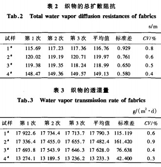 用新型織物透濕性測試方法測試織物的透溫性,出口氮氣流的相對濕度一般在4~6min內穩定下來,這時候1次試驗結束,計算機根據最后10次采集的數據,由式(5)~(7)分別計算試樣的透濕量和總擴散阻抗。4種被測織物的透濕量和總擴散阻抗列于表2、3。從表2可看出,4種試樣總擴散阻抗的標準差均小于ls/m,變異系數小于1%,表3也很清楚地表明,4種試樣的透濕量的變異系數CV值小于1%。由此可見,這種織物透濕性測試方法的重復性較好。