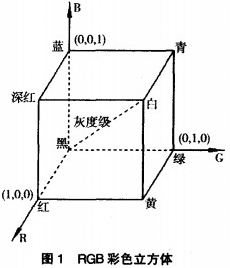 在RGB顏色模型中,每種顏色出現在紅、綠、藍的原色光譜分量中,這個模型是基于笛卡兒坐標系統的,考慮的彩色子空間是圖l所示的立方體。R、G、B位于3個角上,黑色在原點處,白色位于離原點最遠的角上。在該模型中,灰度等級沿著這二點的連線分布,不同的顏色位于立方體上或其內部,并可用從原點分布的向量來定義。如果把所有的顏色值都歸一化,則圖1所示的彩色立方體就是一個單位立方體,即所有的R、G、B的值都在[0,1]范圍內取值。