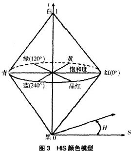 H、I、S顏色模型定義在圓柱坐標系的雙圓錐子集上(圖3)。色度日由水平面的圓周表示,圓周上各點(0360~)代表光譜上各種不同的色調;飽和度s是顏色點與中心軸的距離,在軸上各點飽和度為0在錐面上各點飽和度為1;亮度,的變化是從下錐頂點的黑色(0)逐漸變到上錐頂點的白色(1)。HI模型中,亮度,不受其它顏色信息的影響,可減少外界光照強度變化所帶來的影響,因此選擇此模型作顏色的量化。