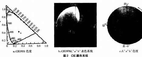 CIE1976L*a*b*空間可由CIE—xYz轉換得到,L*a*b*表色空間又稱為獨立色坐標(圖2b),它是把顏色按其所含紅、綠、黃、藍的程度來度量的。