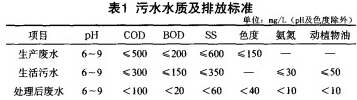 治理方案設計的污水處理量為2040m3/d(包括生活污水1630m。/d),廢水濃度及排放標準如表l。