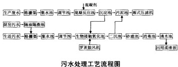 針對該項目中的生產廢水,宜先采用適當?shù)慕禍卮胧?,使出水溫度降?0℃~45℃后再采用混凝一沉淀法進行預處理,經(jīng)預處理的生產廢水與廚房廢水(經(jīng)隔渣、三級隔油處理,去除大部分固體顆粒及浮油)、生活污水混合,采用生物接觸氧化工藝進行好氧處理,處理后的出水再經(jīng)沉淀、過濾、消毒后經(jīng)污水管網(wǎng)排放或回用(綠化及沖廁)。