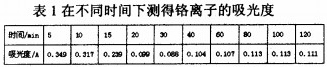 經測定后,各時間點的吸光度如表1所示,吸光度越小,則鉻離子濃度越低。
