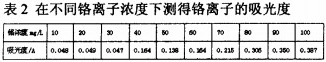 經測定后,各濃度的吸光度如表2所示,吸光度越小,則鉻離子濃度越低。