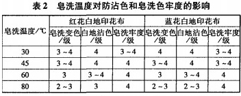 將錦綸/氨綸彈力印花織物在2g/LIntratexPW0工作液中,以不同溫度皂洗5—8min,測試防沾色效果和皂洗色牢度,結果見表2。