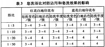 將錦綸/氨綸彈力印花織物在2g/L防沾凈洗劑工作液中,在不同浴比下,45℃皂洗5~8min。測試防沾色效果和皂洗色牢度,結果見表3。