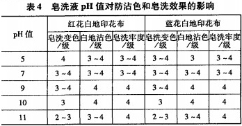 將錦綸/氨綸彈力印花織物在不同pH值的2g/L防沾凈洗劑工作液中,于45℃皂洗5—8min,測試防沾色效果和皂洗牢度,結果見表4。
