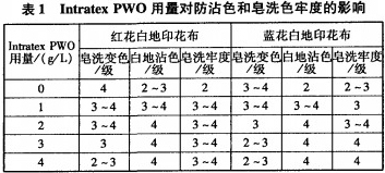 將錦綸/氨綸彈力印花織物在不同用量的IntratexPW0工作液中于45℃皂洗5~8min,測試防沾色效果和皂洗色牢度,結果見表1。