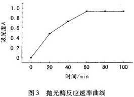 酶與織物之間的作用時(shí)間是非常關(guān)鍵的因素。時(shí)間過短,拋光處理效果不好;時(shí)間過長,織物則有較大的強(qiáng)力損失。將酶促反應(yīng)中吸光度對時(shí)間作圖,得到酶反應(yīng)的速率曲線,見圖3。