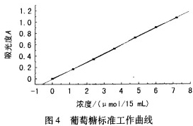 由圖4知,當(dāng)葡萄糖的濃度在0~7.2umol/mL時(shí),葡萄糖的量與吸光度成良好的線性關(guān)系,該標(biāo)準(zhǔn)曲線的線性方程為:Y=0.15066x一0.00875,線性相關(guān)系數(shù)R=0.99984。