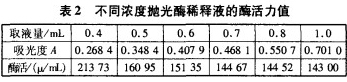 取一定量拋光酶TF一161稀釋至500mL,按照1.4測定酶活,結(jié)果如表2。