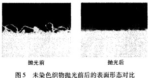 由圖5可以看出,織物拋光后,表面茸毛明顯減少,更加光潔;觀察還發(fā)現(xiàn),染色后織物的色澤更加鮮亮,僅有極小色變。根據(jù)工廠實(shí)際應(yīng)用情況,為了避免色光的偏差,一般采用先拋光后染色的加工工藝。